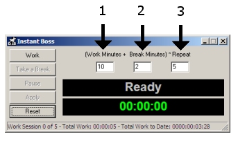 You can either use this from the Windows Run dialog or use it as shortcut targets. The numbers correspond with work-break-repeat, in that order. Please use only numbers, no letters.