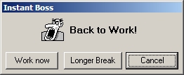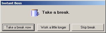 Instant Boss will tell you when it is time to take a break. You will have the choice to keep working a little longer, take your break now, or skip your break and begin next work period.
